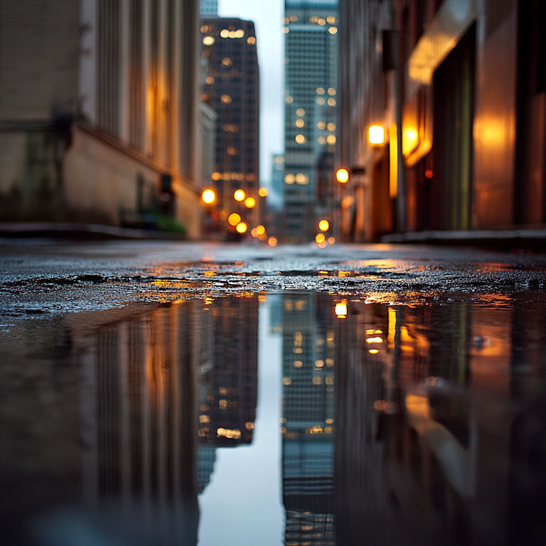 Captures the subject indirectly through a reflective surface like water or glass, adding layers